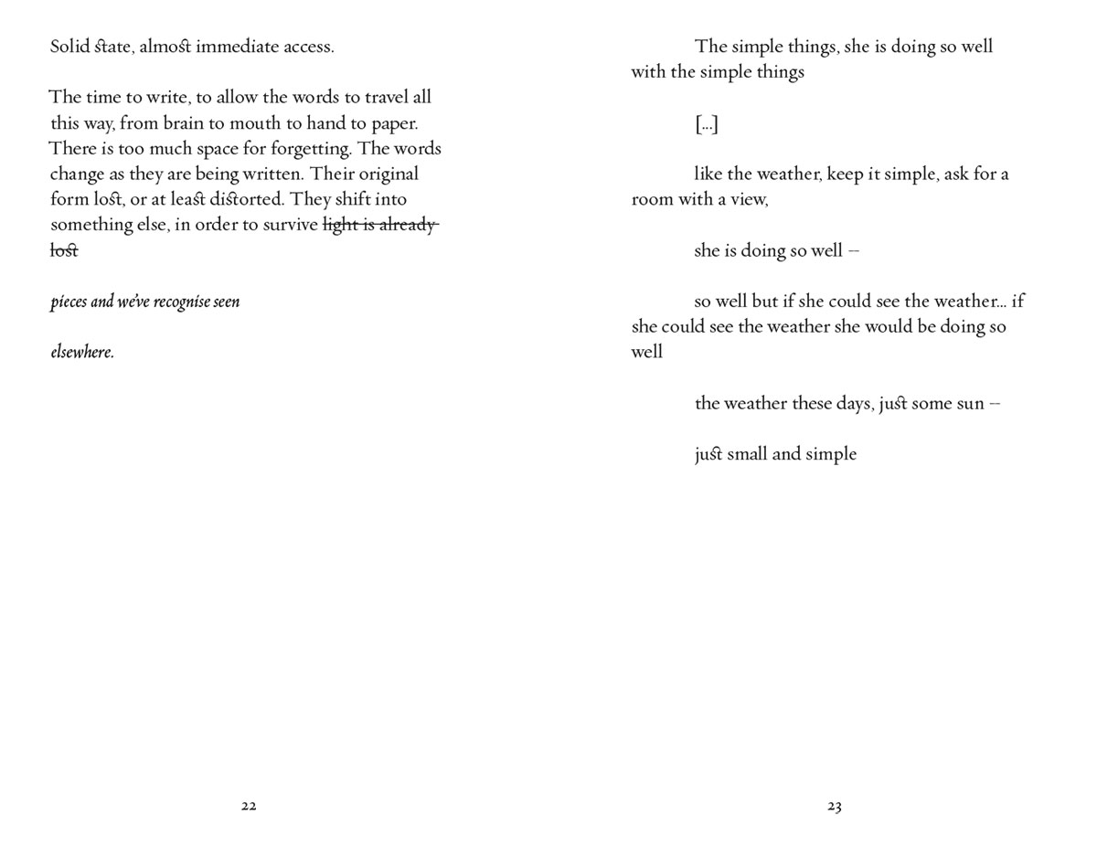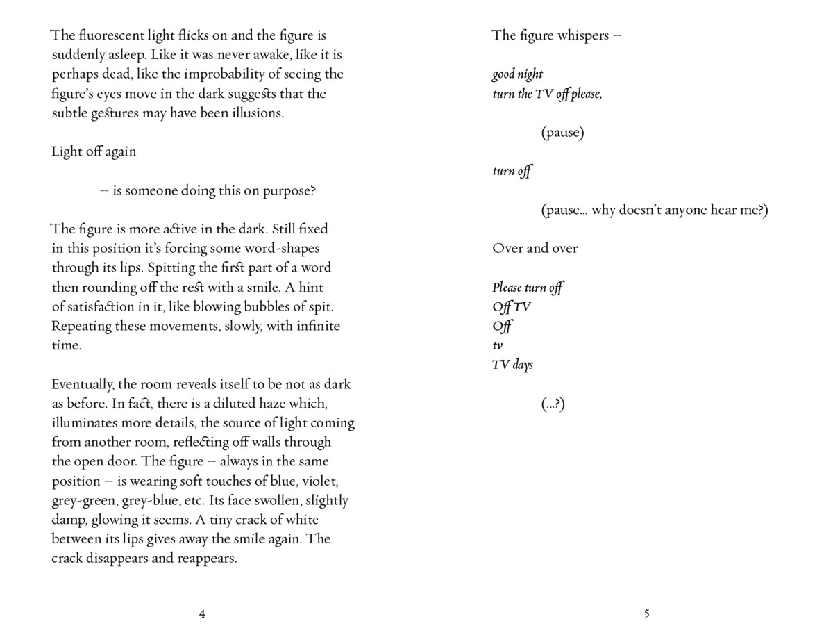 Also, forming words, sentences, phrases is difficult. Even if you know words you can’t find them. You can’t pull them out. We sit, patiently, watchingyou try and make the connection between seeing the words, knowing their sound, and making them emerge from your throat. That action you do with your hands, trying to push them forward over the gap in your head, or when you put your fingers in your mouth, pulling them from somewhere within. It’s not working yet. We have to try and find the words. They are there, just locked away, still crystallised. We look for patterns, little triggers that stimulate more complex patterns, that form layers of association, that bring forth air in your lungs, that fill pockets of air in your mouth, that bring forth words, that we can hear and understand. Not so much erased as rearranged. We are not concerned with recreating the things that trigger the associations. We are concerned with the points of connection between the things. The network that has been ruptured. The things themselves remain, they are protected and you protect them. Even if the thing has corroded, its form is embedded, and with time that form can be remade. For now, it’s aquestion of access. |